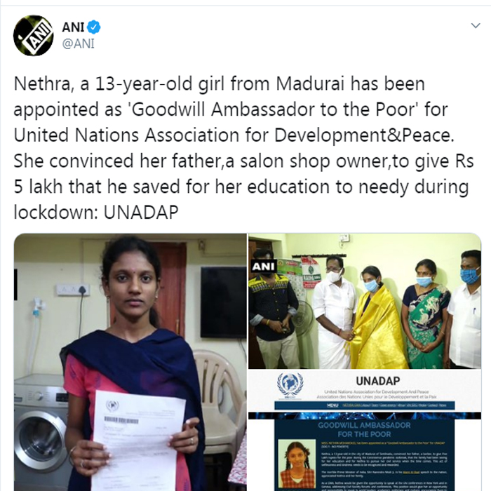 चेन्नई, एजेंसियां। कोरोना संक्रमण (Corona Crisis) के कारण लॉकडाउन (Lockdown) में फंसे लोगों की मदद के लिए अपनी जीवनभर की कमाई खर्च कर देने वाले मदुरै के सैलून संचालक सी. मोहन (C Mohan) की बेटी एम नेत्रा (M Nethra) को संयुक्त राष्ट्र (United Nations) ने यूनाइटेड नेशन एसोसिएशन फॉर डेवलपमेंट एंड पीस (UNADAP) का ‘गुडविल एंबेसडर टू द पूअर’ नियुक्त किया है। आठवीं की छात्रा 13 वर्षीय नेत्रा को एक लाख रुपये की छात्रवृत्ति भी प्रदान की गई है।